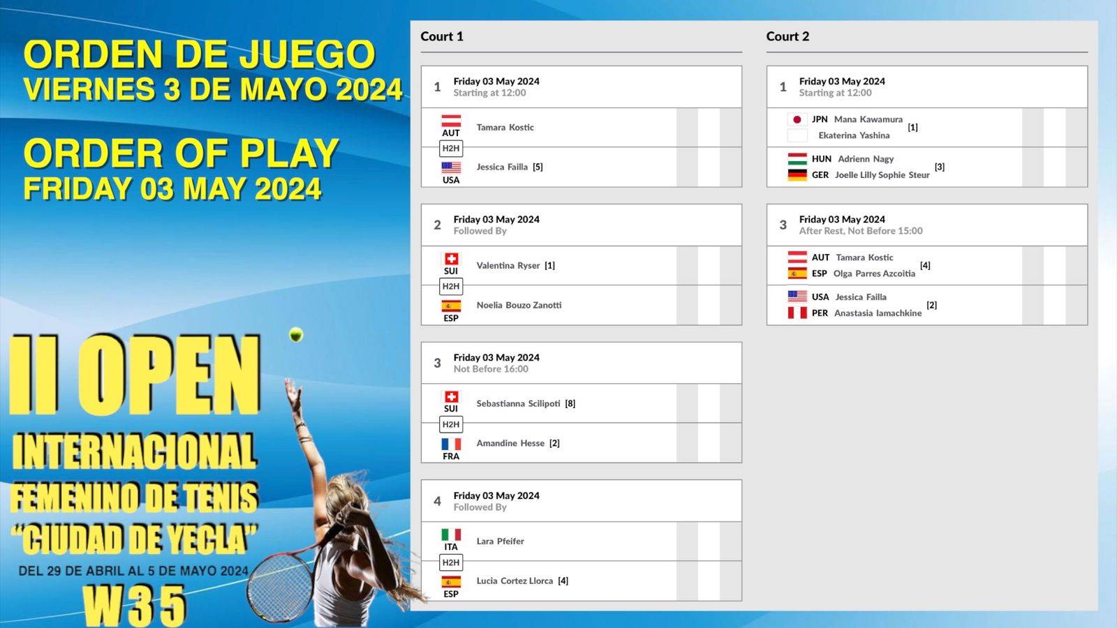 II OPEN ITF W35 “CIUDAD DE YECLA” Organiza: Yecla Club de Tenis y Excmo. Ayuntamiento de Yecla. 03/05/2024 Horarios de Hoy Viernes.